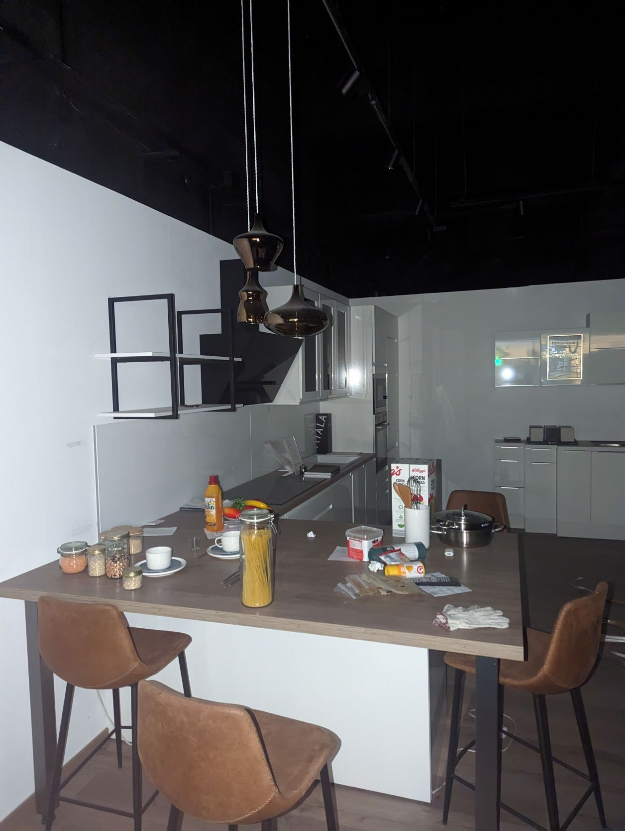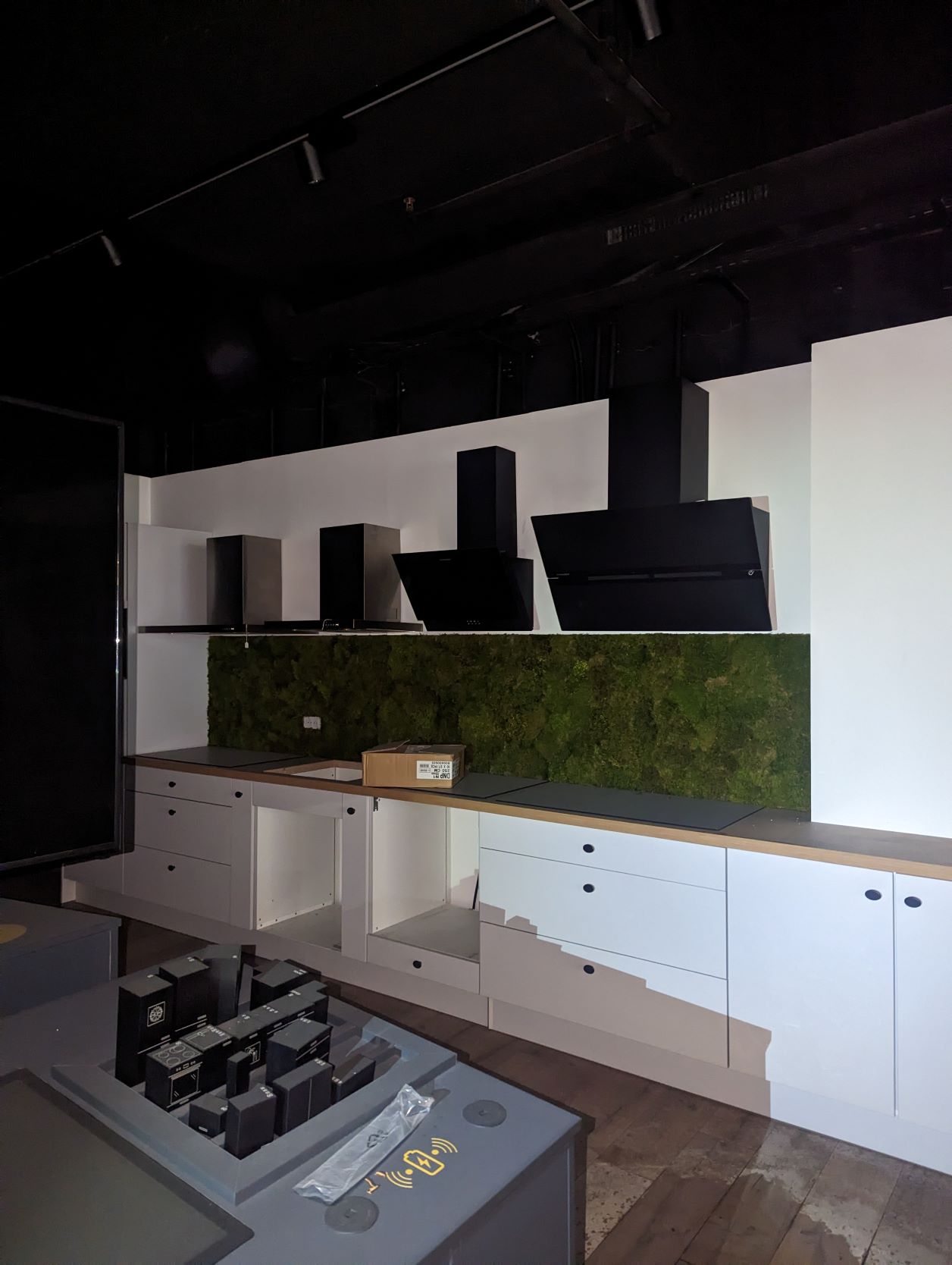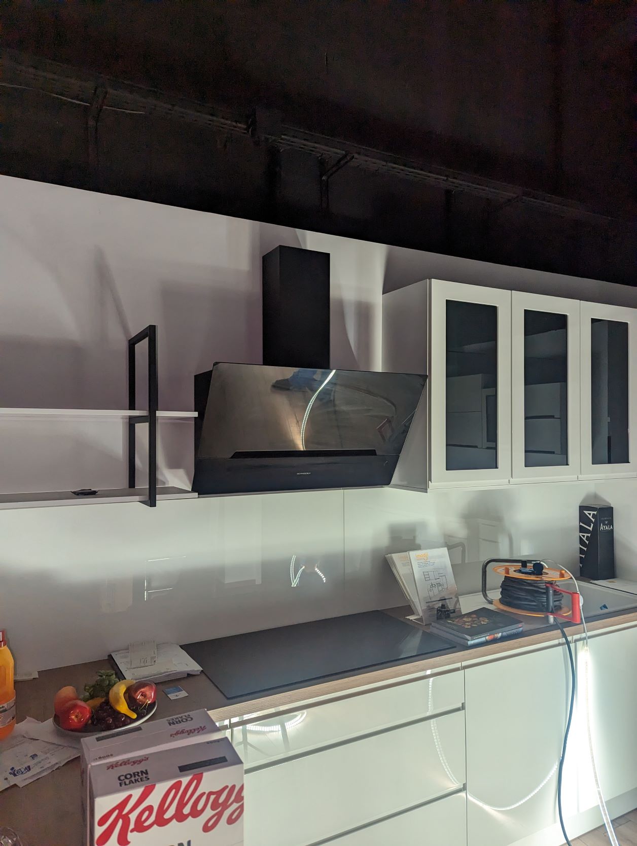 3. 1 élément de cuisine avec quatre tabourets hauts en simili cuir, une hotte SCHNEIDER, une plaque