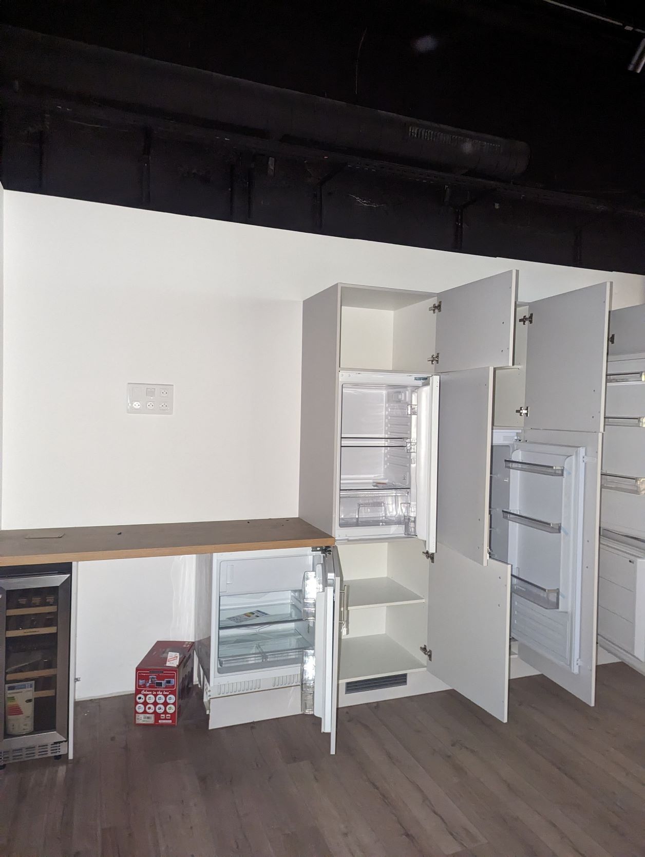 7. 1 élément de cuisine avec une cave à vins SCHNEIDER, un réfrigérateur, un congélateur, deux