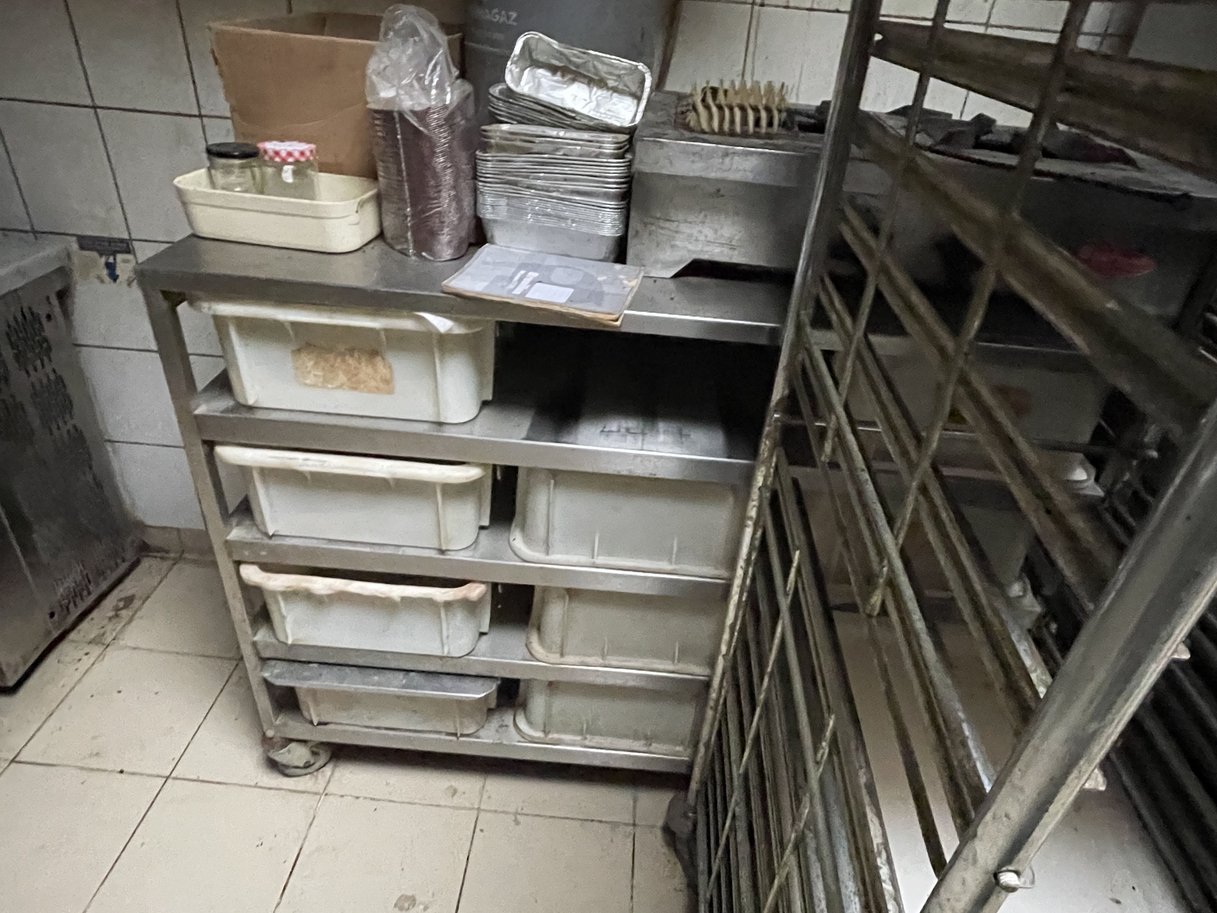 - 1 table inox avec étagères doubles et bacs de rangement plastique