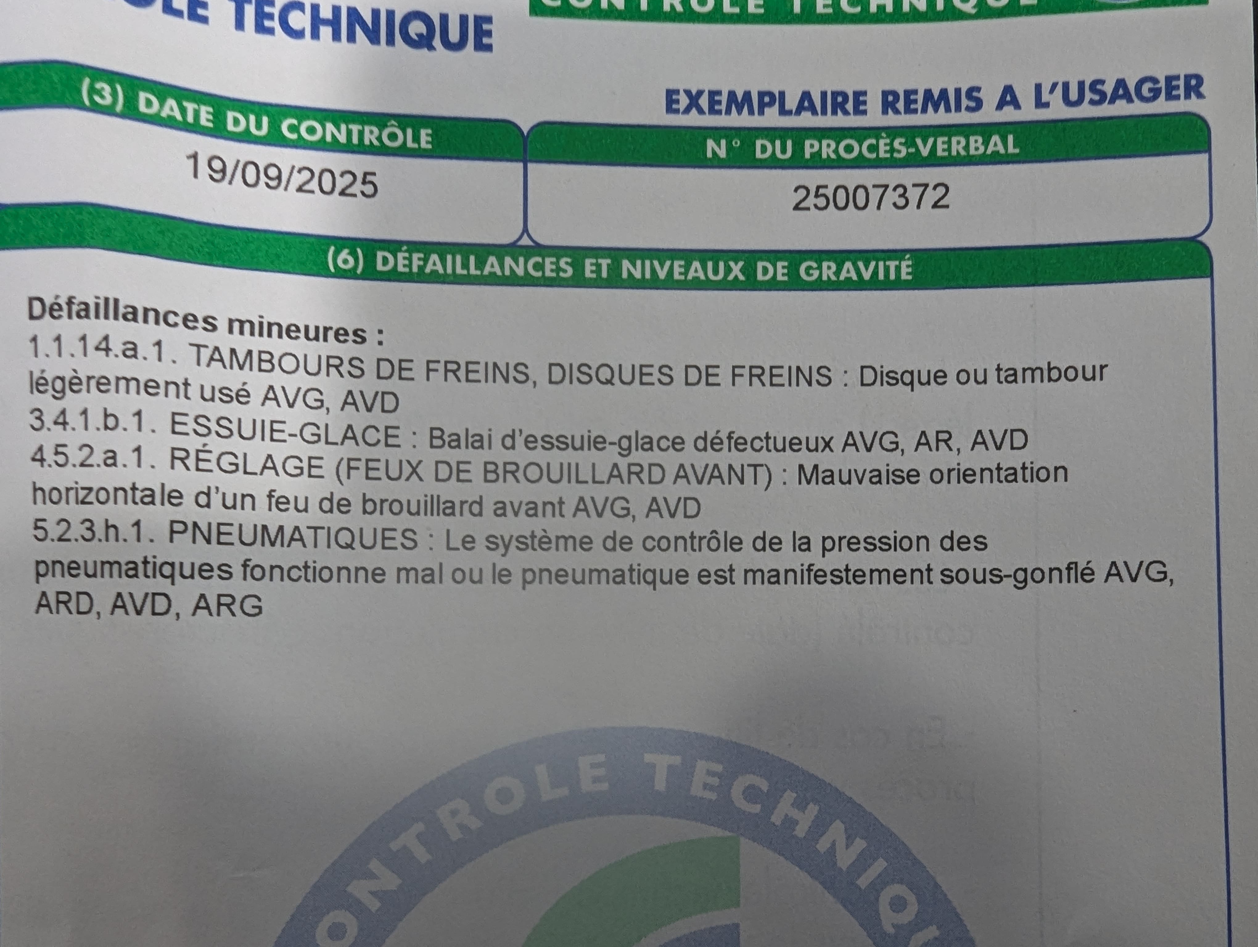 CONTROLE TECHNIQUE OK avec défaillances mineures
